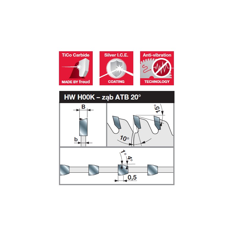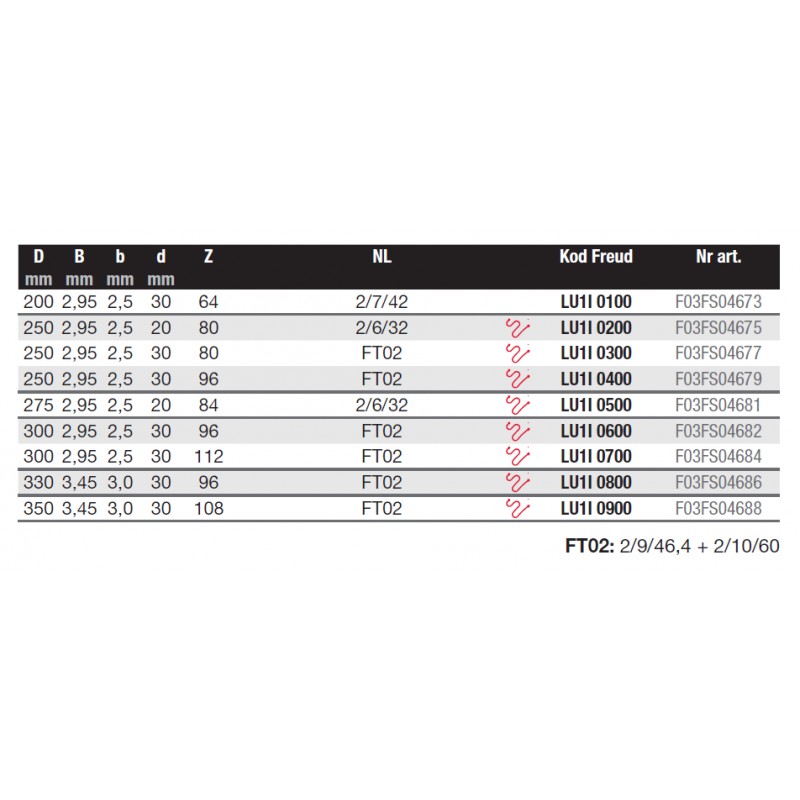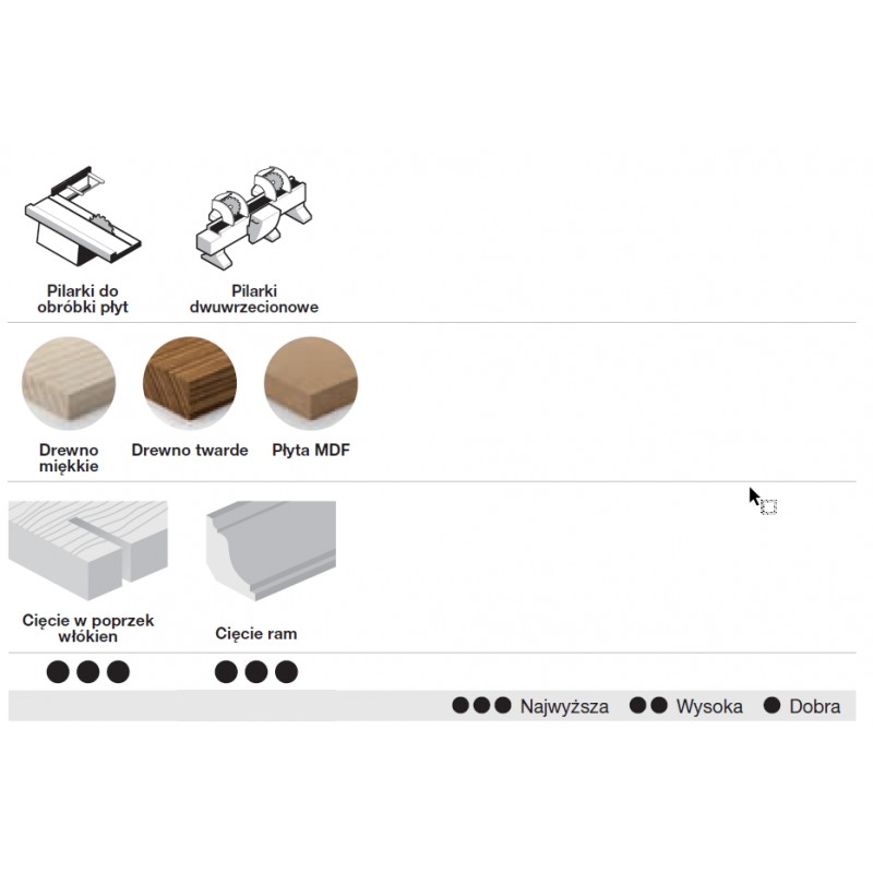 | Średnica piły | Szerokość rzazu piły | Szerokość płaszcza piły | Średnica otworu mocującego | Liczba zębów piły | Kształt zęów | Kąt natarcia | Kod Freud | Nr katalogowy | Kod Ean |