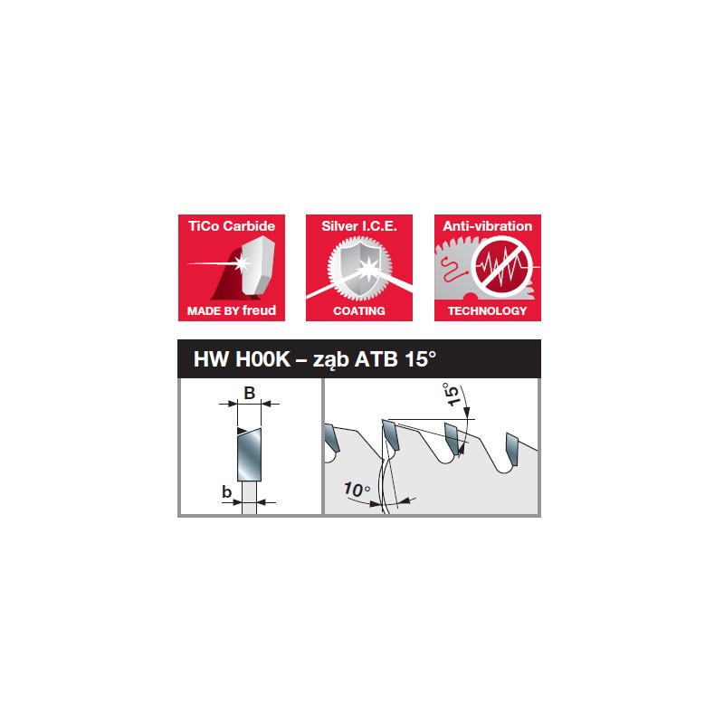 | Średnica piły | Szerokość rzazu piły | Szerokość płaszcza piły | Średnica otworu mocującego | Liczba zębów piły | Kształt zęów | Kąt natarcia | Kod Freud | Nr katalogowy | Kod Ean |