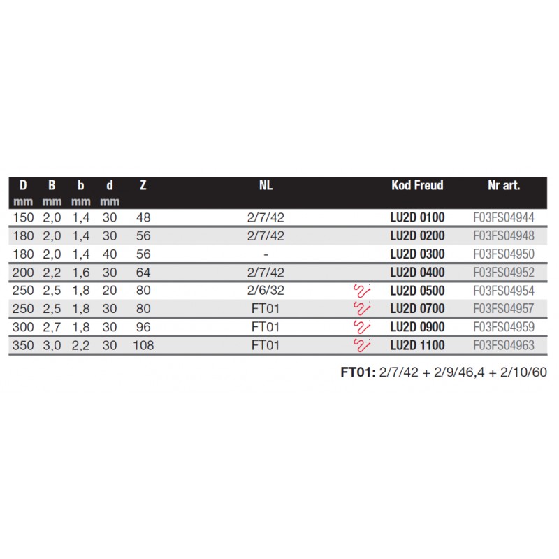 | Średnica piły | Szerokość rzazu piły | Szerokość płaszcza piły | Średnica otworu mocującego | Liczba zębów piły | Kształt zęów | Kąt natarcia | Kod Freud | Nr katalogowy | Kod Ean |