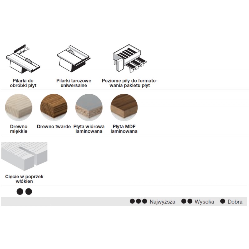Dobra jakość obróbki podczas cięcia drewna miękkiego i twardego w poprzek włókien.