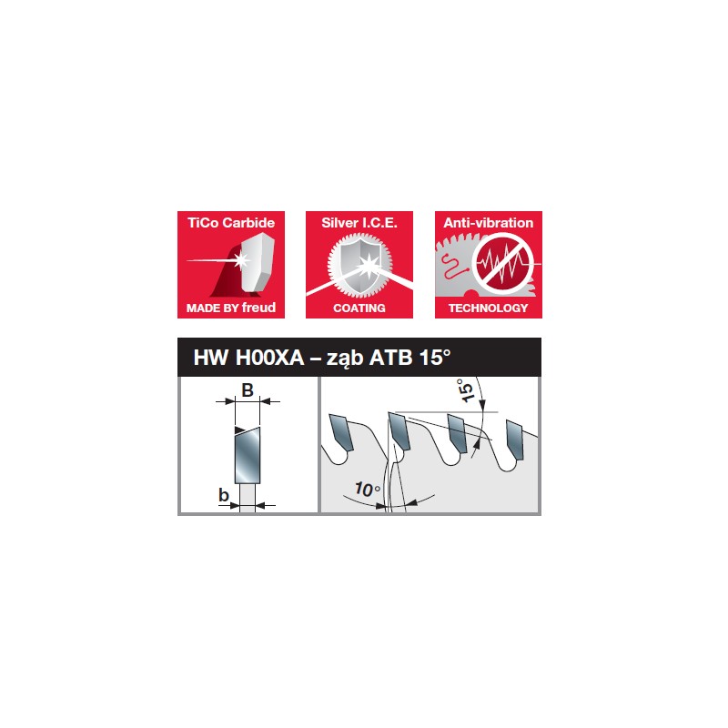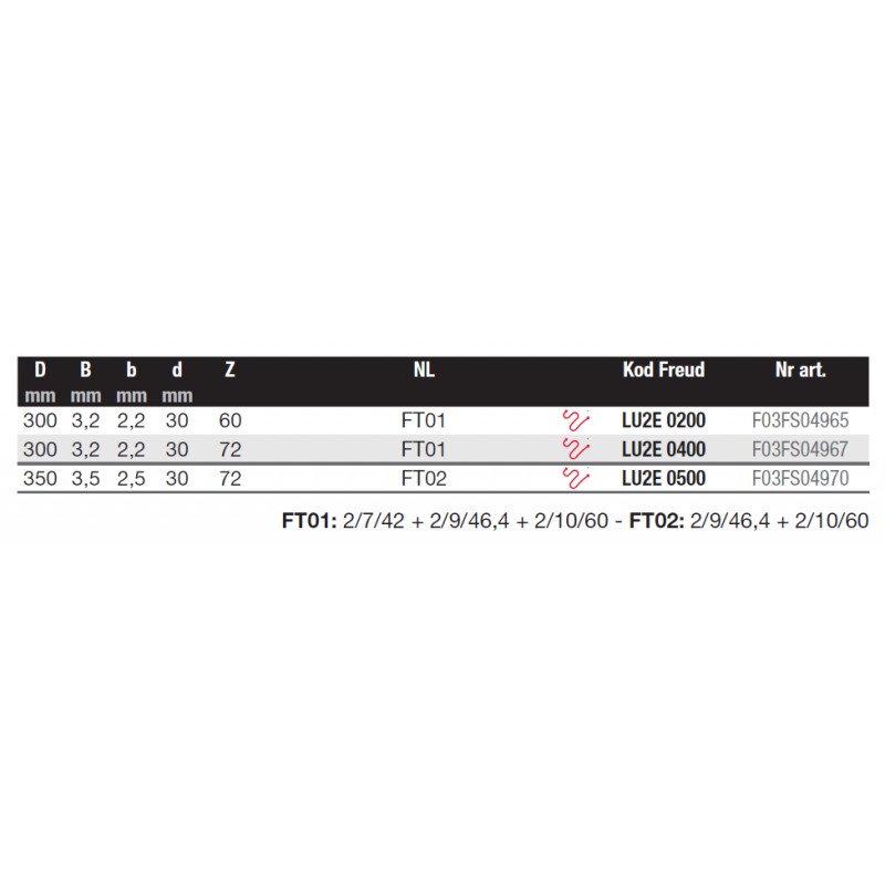 | Średnica piły | Szerokość rzazu piły | Szerokość płaszcza piły | Średnica otworu mocującego | Liczba zębów piły | Kształt zęów | Kąt natarcia | Kod Freud | Nr katalogowy | Kod Ean |