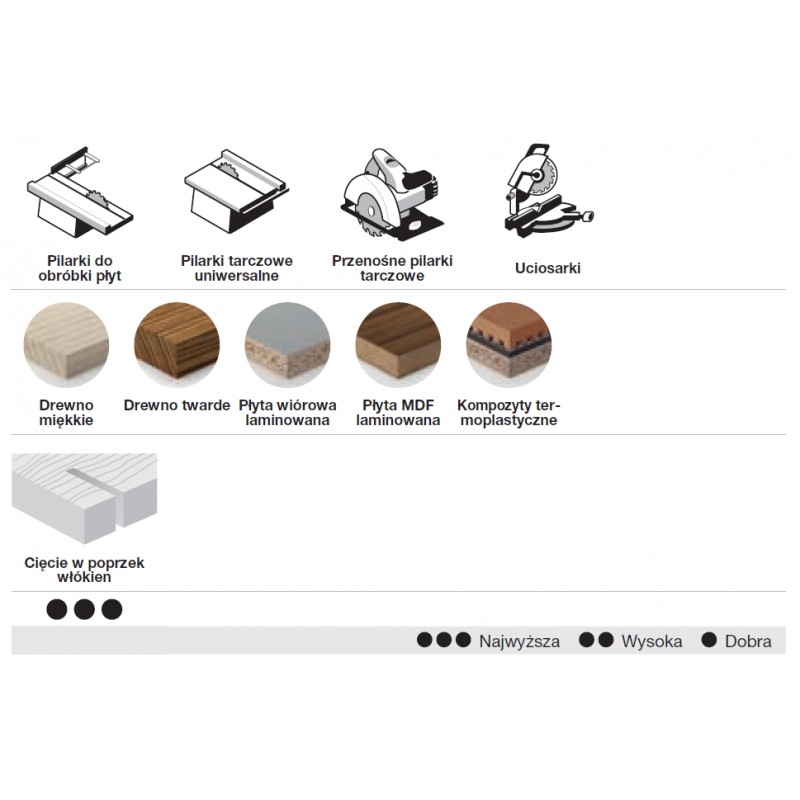 Piły do formatowania płyt obustronnie laminowanych bez użycia podcinacza, dobra jakość obróbki i długi okres eksploatacji.