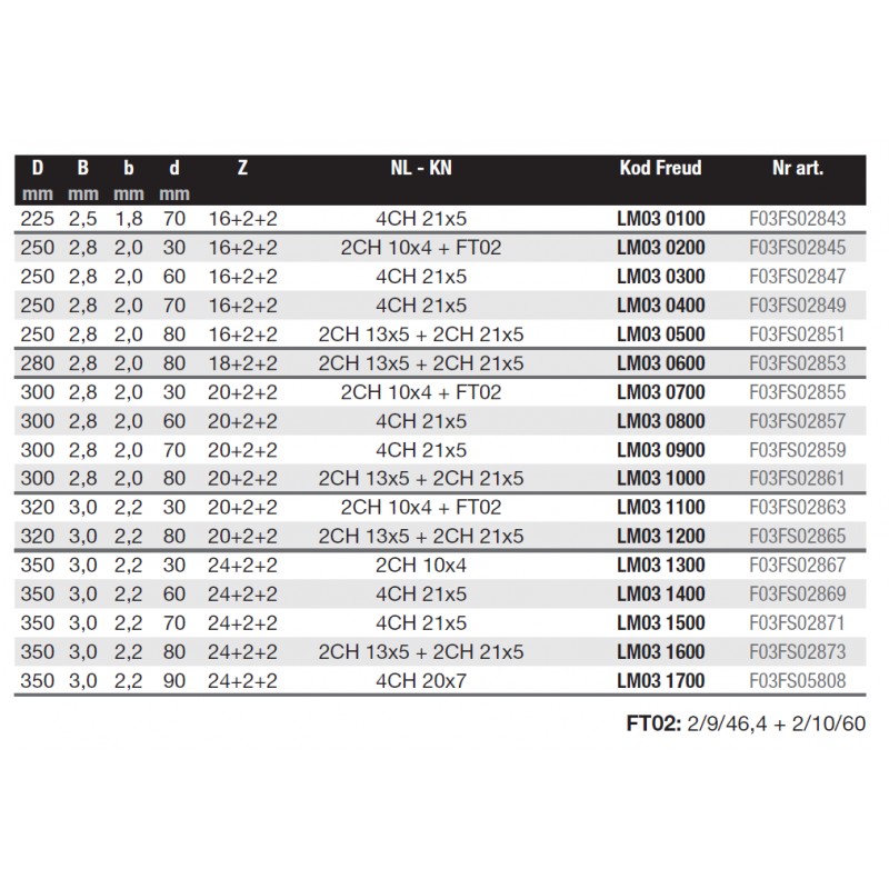 Kształt zębów | Kąt natarcia | Kod Freud | Nr katalogowy | Kod Ean |