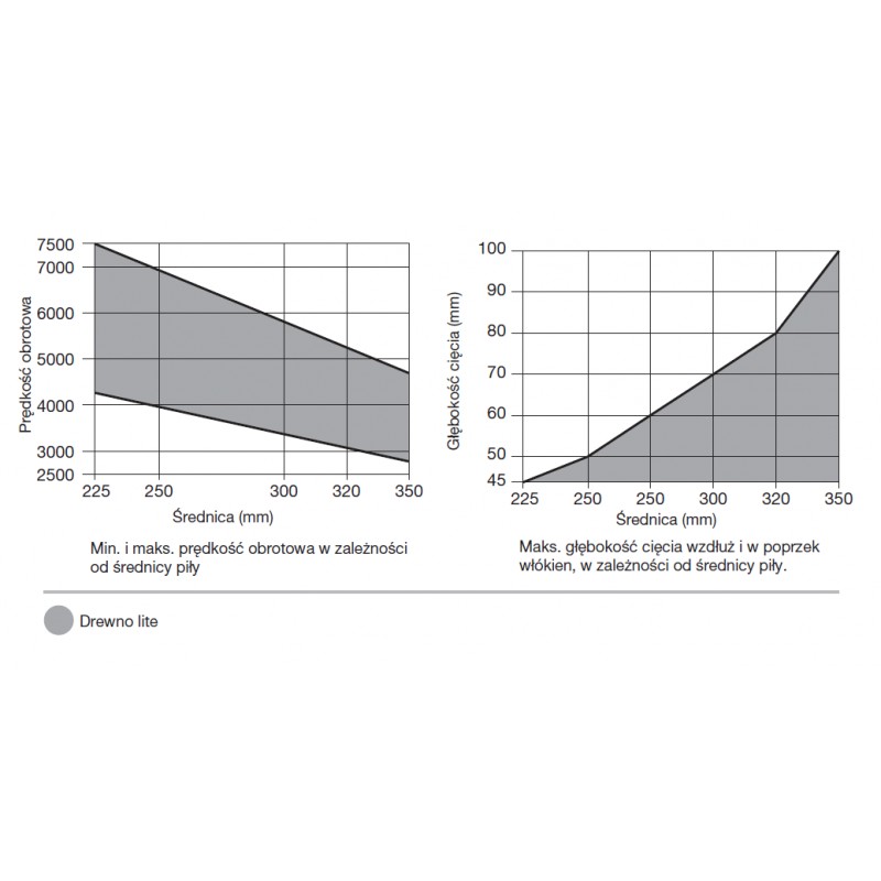 | Średnica piły | Szerokość rzazu piły | Szerokość płaszcza piły | Średnica otworu mocującego | Liczba zębów piły |