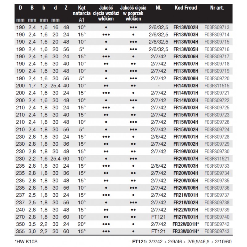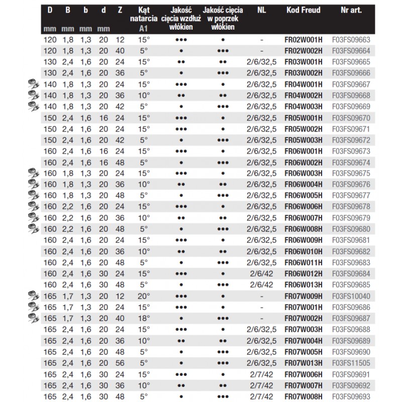 Kształt zębów | Kąt natarcia | Kod Freud | Nr katalogowy | Kod Ean |
