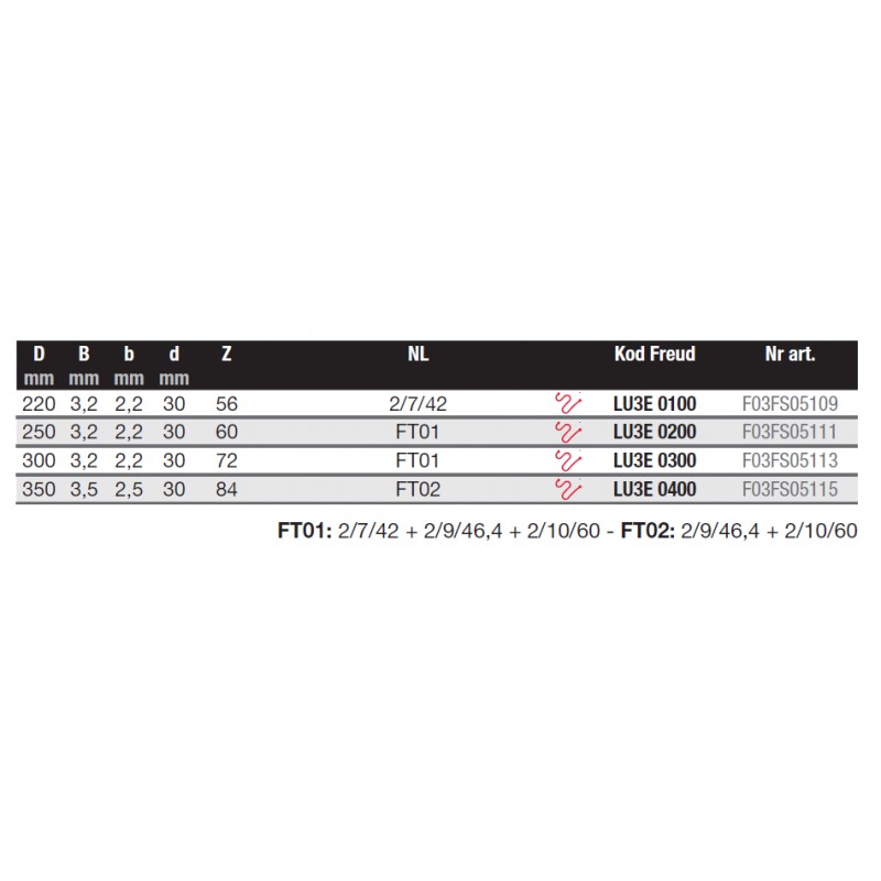 | Średnica piły | Szerokość rzazu piły | Szerokość płaszcza piły | Średnica otworu mocującego | Liczba zębów piły | Kształt zęów | Kąt natarcia | Kod Freud | Nr katalogowy | Kod Ean |