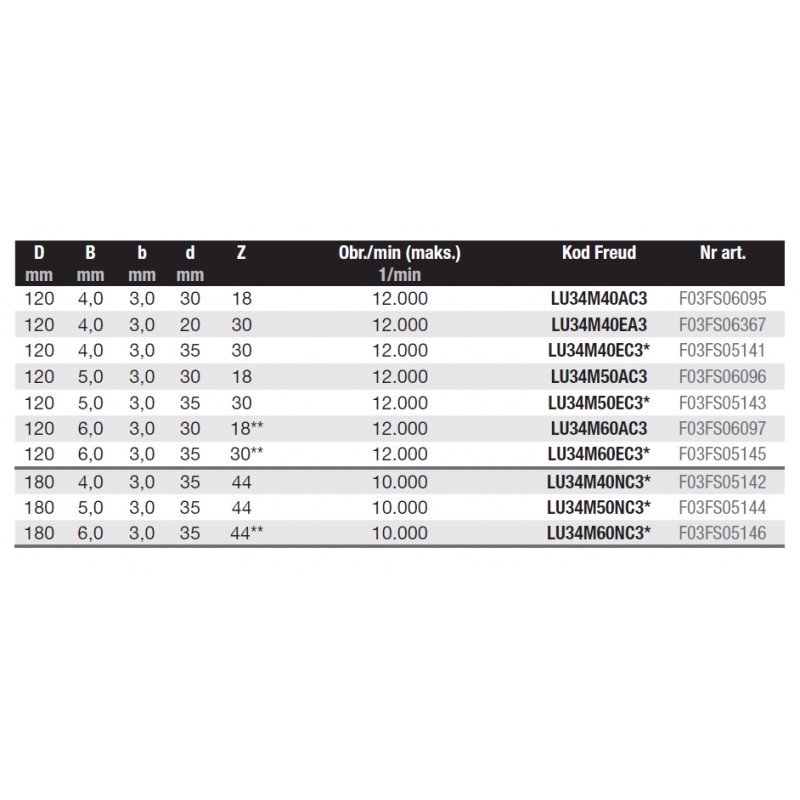 | Średnica piły | Szerokość rzazu piły | Szerokość płaszcza piły | Średnica otworu mocującego | Liczba zębów piły | Kształt zęów | Kąt natarcia | Kod Freud | Nr katalogowy | Kod Ean |