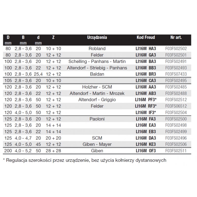 | Średnica piły | Szerokość rzazu piły | Szerokość płaszcza piły | Średnica otworu mocującego | Liczba zębów piły | Kształt zęów | Kąt natarcia | Kod Freud | Nr katalogowy | Kod Ean |